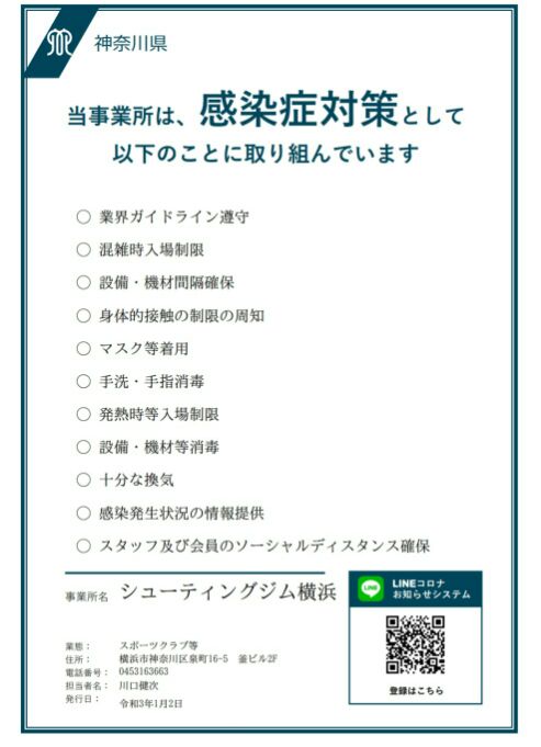 コロナウイルス第2波が来てるので、シューティングジム横浜ではコロナ対策として引き続き人数制限、手荒いうがい、マスク着用、用具備品の消毒、会員またはスタッフの健康チェックをしてます。